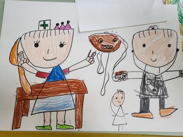 6. 작품에 대한 설명 : 지우는 간호사가 되고싶다고 합니다. 간호사선생님은 무언가 끄적이며 의사선생님께서는 악당과 손을 잡고 치료를 하고 계시다고 하네요^_^